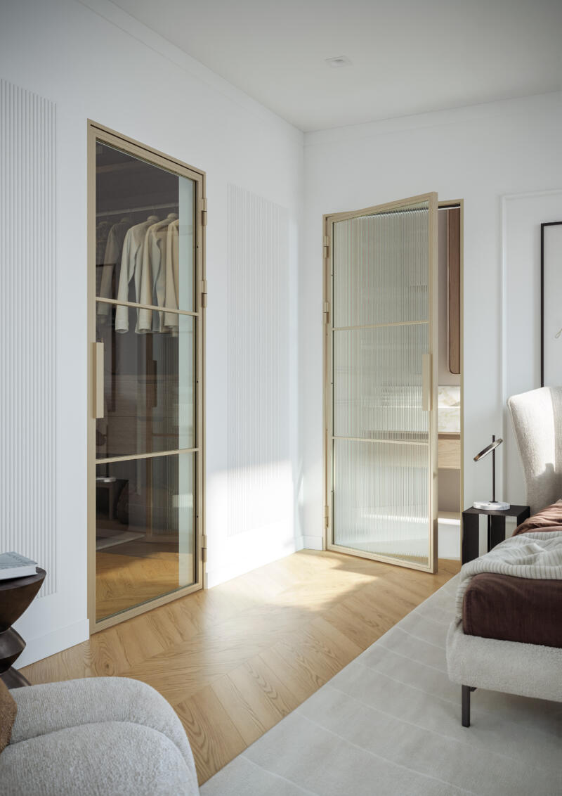 The design line offers transparent door leaves with a metal frame (steel or aluminum) or with classic, warm wooden frame. It's modernity that will work in any home – and is also safe for children.
