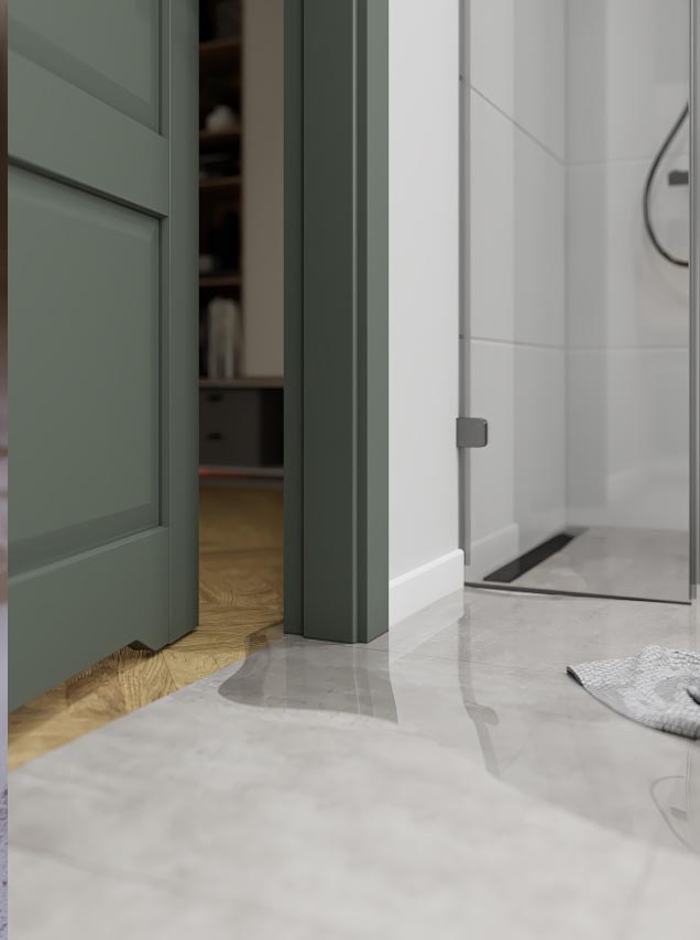 Poorly designed interior in a small bathroom? Unfortunate linear drain in the shower opens to the bathroom door? With the HYDRO PROTECT™ door frame you can feel at ease – it is 100% moisture resistant, even with prolonged exposure to water.