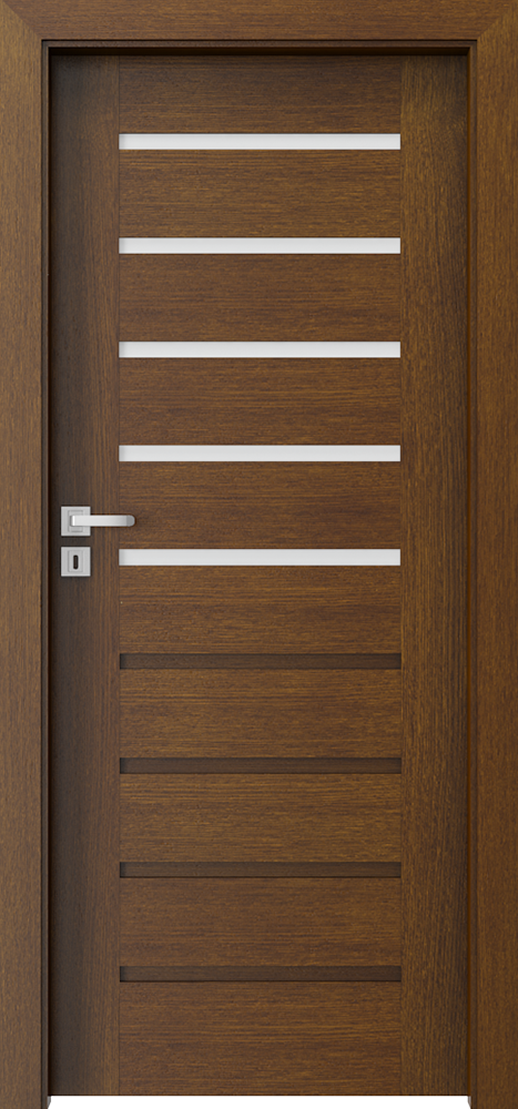 Цялата е покрита с естествен фурнир. Повърхността на крилото е защитена с екологични лакове на водна основа, фурнири от следните групи: Селект,Натурaлен Дъб, Сатен бели) са втвърдени чрез UV технология (полумат). Закалено матирано стъкло.
