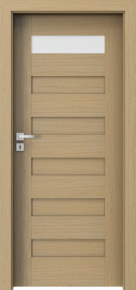 Цялата е покрита с естествен фурнир. Повърхността на крилото е защитена с екологични лакове на водна основа, фурнири от следните групи: Селект,Натурaлен Дъб, Сатен бели) са втвърдени чрез UV технология (полумат). Закалено матирано стъкло.