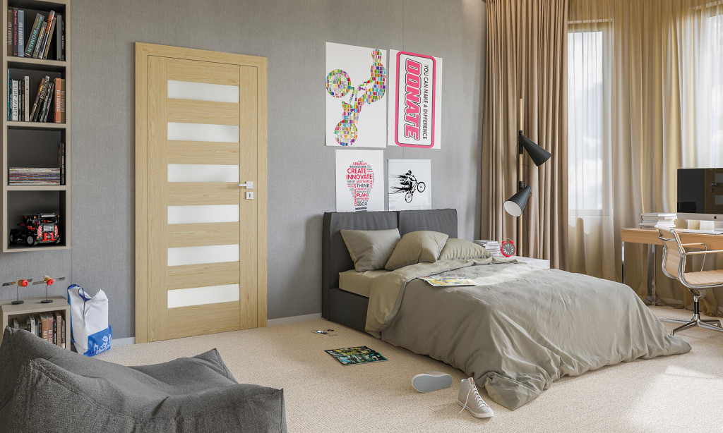 Цялата е покрита с естествен фурнир. Повърхността на крилото е защитена с екологични лакове на водна основа, фурнири от следните групи: Селект,Натурaлен Дъб, Сатен бели) са втвърдени чрез UV технология (полумат). Закалено матирано стъкло.