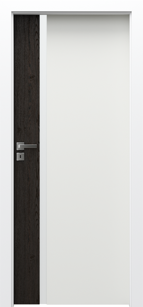 Крилото на вратата се състои от: широка, лакирана част и тясна вложка, покрита с естествен или синтетичен фурнир. Остъклена врата със закалено матово стъкло с дебелина 8 мм или черно ламинирано безопасно стъкло (опция срещу допълнително заплащане), което е част от крилото. Бяла лакирана част – сатенено-гладка лакова повърхност, постигната чрез технология за UV лакиране. Част от