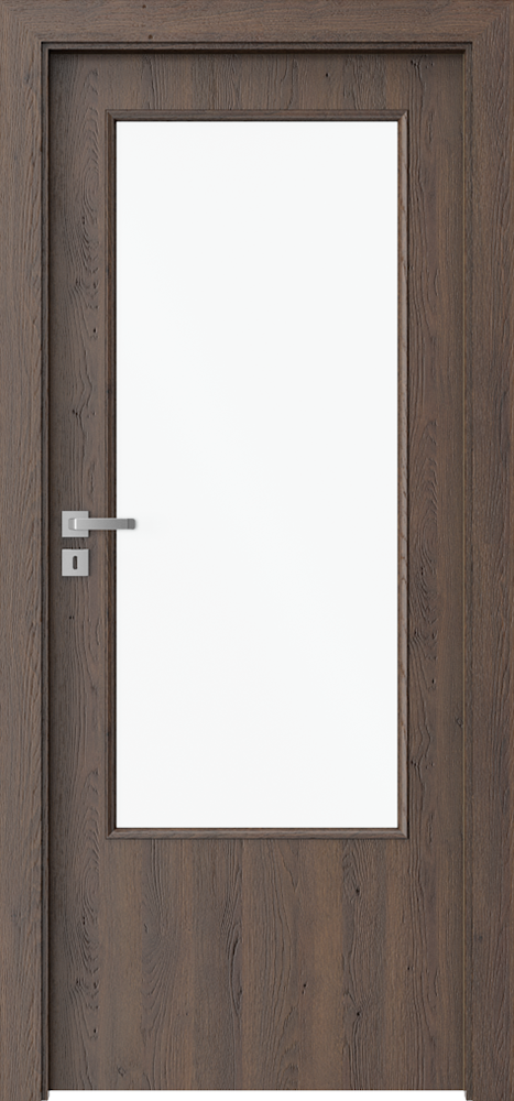 There is lipping ABS on the side edges. Models with decorative inlays – black or silver, 6 mm wide. Glazing – models of group 1 and 7 ‘chinchilla’ glass; frosted tempered glass; transparent glass. Models of group 4 – 8 mm thick frosted, lamienated safety glass. Black glazing is available for model 4.A (optionally at extra charge). The door leaf is skinned with a Gladstone/Halifax board (with structure), a door frame is finished with matching CPL Veneer 0,2 mm.