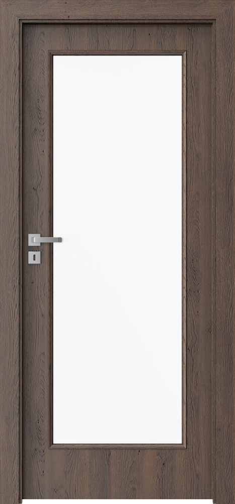 There is lipping ABS on the side edges. Models with decorative inlays – black or silver, 6 mm wide. Glazing – models of group 1 and 7 ‘chinchilla’ glass; frosted tempered glass; transparent glass. Models of group 4 – 8 mm thick frosted, lamienated safety glass. Black glazing is available for model 4.A (optionally at extra charge). The door leaf is skinned with a Gladstone/Halifax board (with structure), a door frame is finished with matching CPL Veneer 0,2 mm.