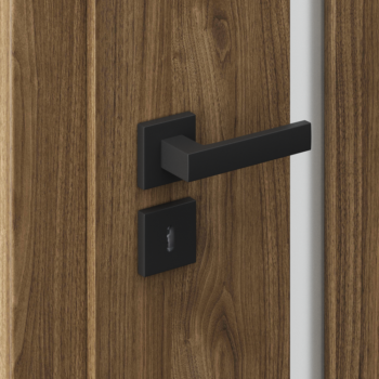 - černý magnetický zámek a černé čepové závěsy v polodrážkových dveřích