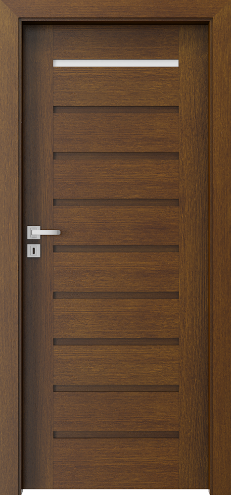 A door leaf is finished with Natural Veneer. Surface is protectedby ecological water-based varnishes. Select, Natural Oak and Satin (apart from white) veneers are hardened under UV lamp (semi-matt). Tempered frosted glass.
