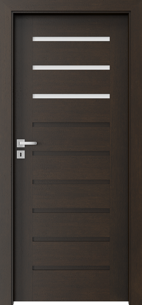A door leaf is finished with Natural Veneer. Surface is protectedby ecological water-based varnishes. Select, Natural Oak and Satin (apart from white) veneers are hardened under UV lamp (semi-matt). Tempered frosted glass.
