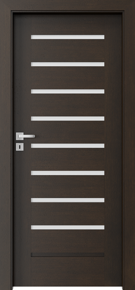 A door leaf is finished with Natural Veneer. Surface is protectedby ecological water-based varnishes. Select, Natural Oak and Satin (apart from white) veneers are hardened under UV lamp (semi-matt). Tempered frosted glass.