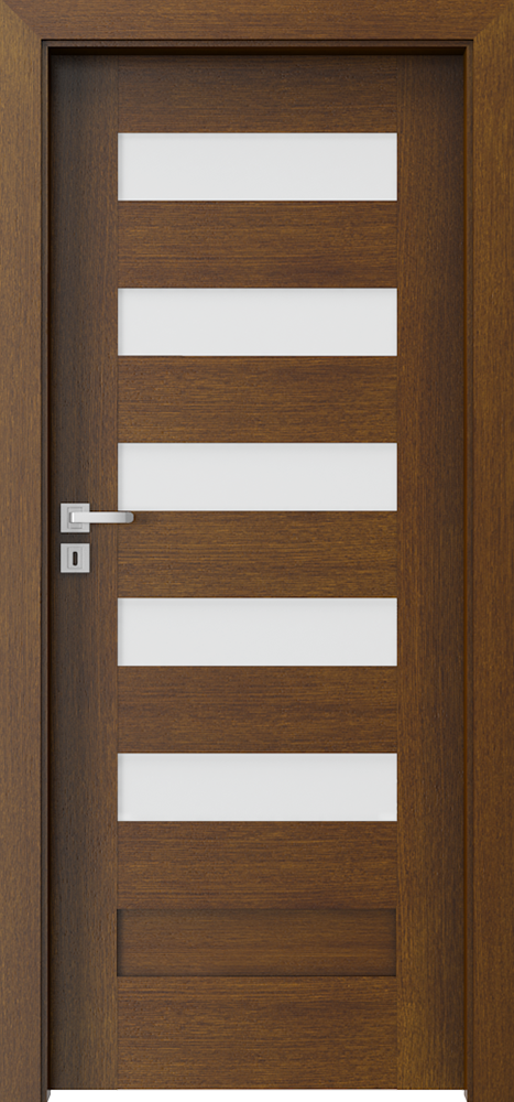 A door leaf is finished with Natural Veneer. Surface is protectedby ecological water-based varnishes. Select, Natural Oak and Satin (apart from white) veneers are hardened under UV lamp (semi-matt). Tempered frosted glass.
