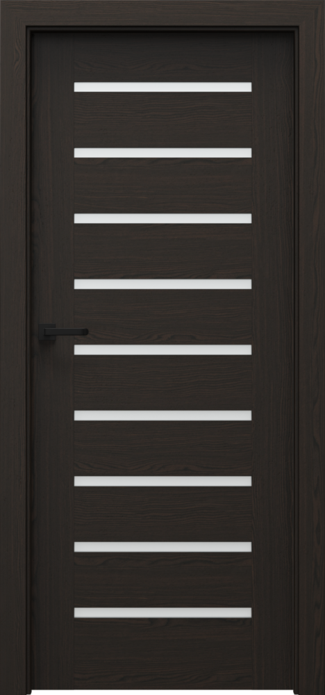 A door leaf is finished with Natural Veneer. Surface is protectedby ecological water-based varnishes. Select, Natural Oak and Satin (apart from white) veneers are hardened under UV lamp (semi-matt). Tempered frosted glass.