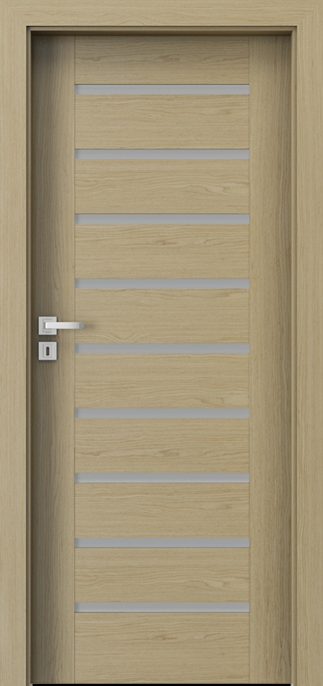 A door leaf is finished with Natural Veneer. Surface is protectedby ecological water-based varnishes. Select, Natural Oak and Satin (apart from white) veneers are hardened under UV lamp (semi-matt). Tempered frosted glass.