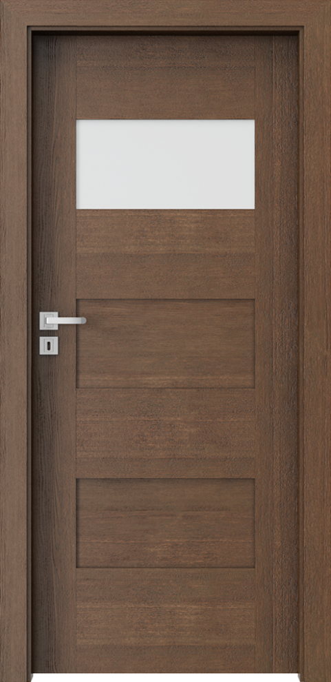 A door leaf is finished with Natural Veneer. Surface is protectedby ecological water-based varnishes. Select, Natural Oak and Satin (apart from white) veneers are hardened under UV lamp (semi-matt). Tempered frosted glass.