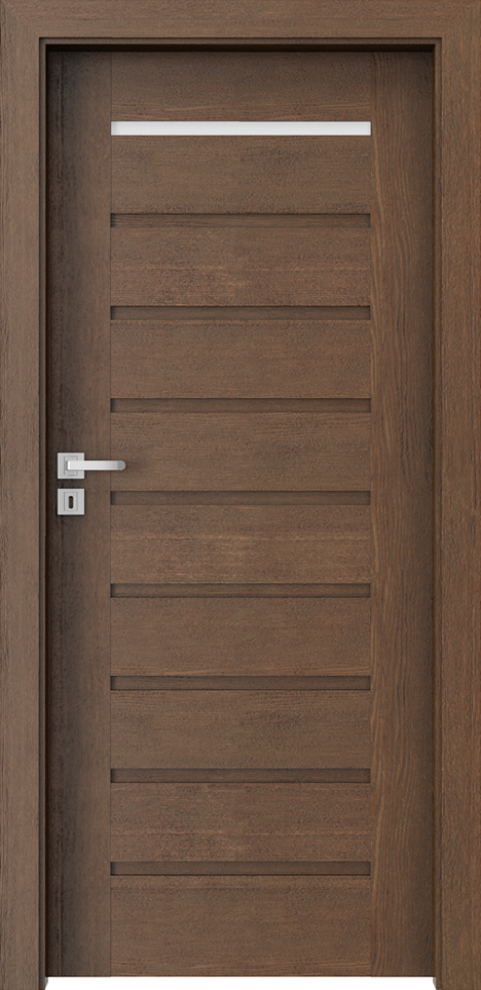 A door leaf is finished with Natural Veneer. Surface is protectedby ecological water-based varnishes. Select, Natural Oak and Satin (apart from white) veneers are hardened under UV lamp (semi-matt). Tempered frosted glass.