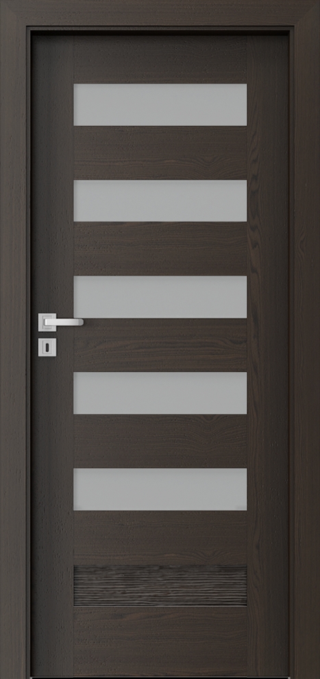 A door leaf is finished with Natural Veneer. Surface is protectedby ecological water-based varnishes. Select, Natural Oak and Satin (apart from white) veneers are hardened under UV lamp (semi-matt). Tempered frosted glass.