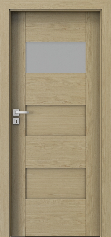 A door leaf is finished with Natural Veneer. Surface is protectedby ecological water-based varnishes. Select, Natural Oak and Satin (apart from white) veneers are hardened under UV lamp (semi-matt). Tempered frosted glass.