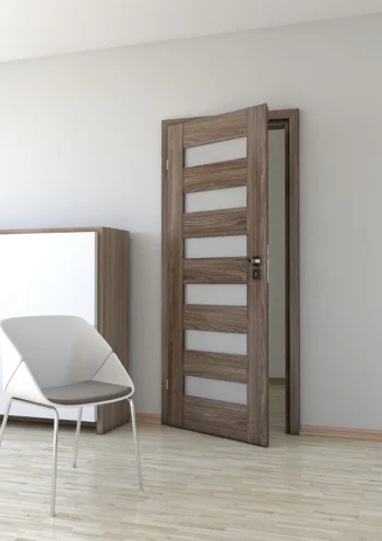 Door leaves contain rails and stiles, slim panels and 6 mm thick, frosted, tempered glass. A combination of those depends on a model. Preparation for shortening – maximum 60 mm. Size ‚100‘ requires a third hinge.