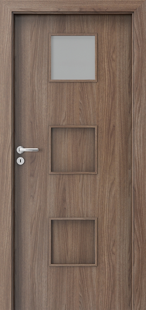 Honeycomb or chipboard core reinforced with rails and stiles (option at extra charge). The construction is skinned with HDF. Chipboard core has a preparation for shortening as a standard. Reinforcement for a door closer and sizes ‚100’ and ‚110‘ requires a third hinge.
