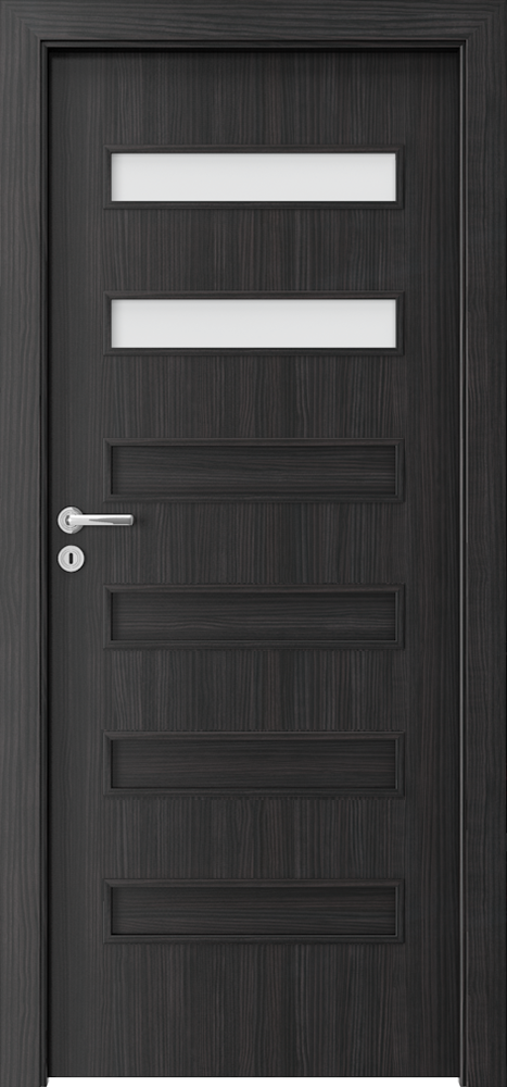 Honeycomb or chipboard core reinforced with rails and stiles (option at extra charge). The construction is skinned with HDF. Chipboard core has a preparation for shortening as a standard. Reinforcement for a door closer and sizes ‚100’ and ‚110‘ requires a third hinge.