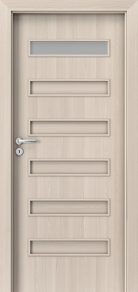 Honeycomb or chipboard core reinforced with rails and stiles (option at extra charge). The construction is skinned with HDF. Chipboard core has a preparation for shortening as a standard. Reinforcement for a door closer and sizes ‚100’ and ‚110‘ requires a third hinge.