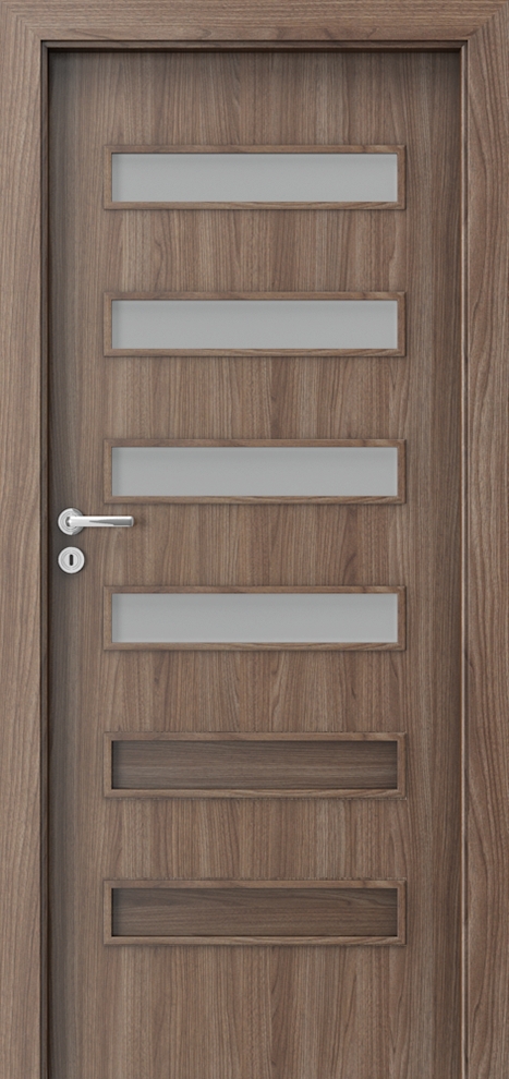 Honeycomb or chipboard core reinforced with rails and stiles (option at extra charge). The construction is skinned with HDF. Chipboard core has a preparation for shortening as a standard. Reinforcement for a door closer and sizes ‚100’ and ‚110‘ requires a third hinge.
