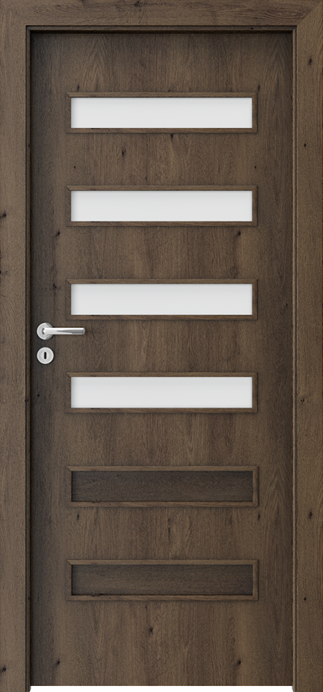 Honeycomb or chipboard core reinforced with rails and stiles (option at extra charge). The construction is skinned with HDF. Chipboard core has a preparation for shortening as a standard. Reinforcement for a door closer and sizes ‚100’ and ‚110‘ requires a third hinge.
