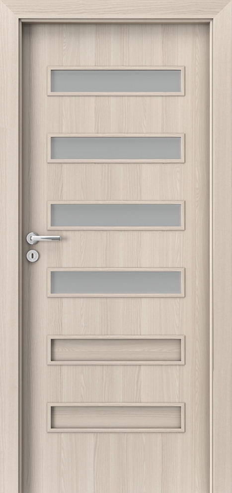 Honeycomb or chipboard core reinforced with rails and stiles (option at extra charge). The construction is skinned with HDF. Chipboard core has a preparation for shortening as a standard. Reinforcement for a door closer and sizes ‚100’ and ‚110‘ requires a third hinge.