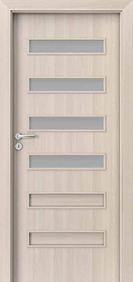 Honeycomb or chipboard core reinforced with rails and stiles (option at extra charge). The construction is skinned with HDF. Chipboard core has a preparation for shortening as a standard. Reinforcement for a door closer and sizes ‚100’ and ‚110‘ requires a third hinge.