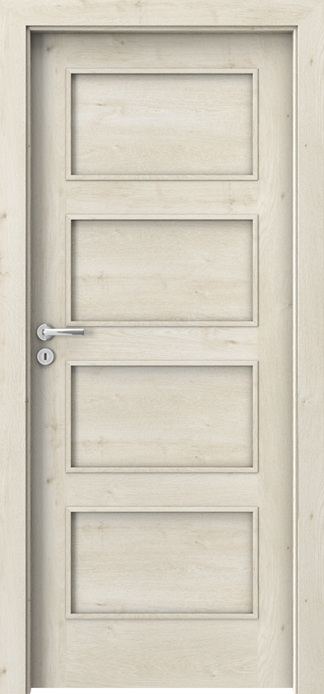 Honeycomb or chipboard core reinforced with rails and stiles (option at extra charge). The construction is skinned with HDF. Chipboard core has a preparation for shortening as a standard. Reinforcement for a door closer and sizes ‚100’ and ‚110‘ requires a third hinge.