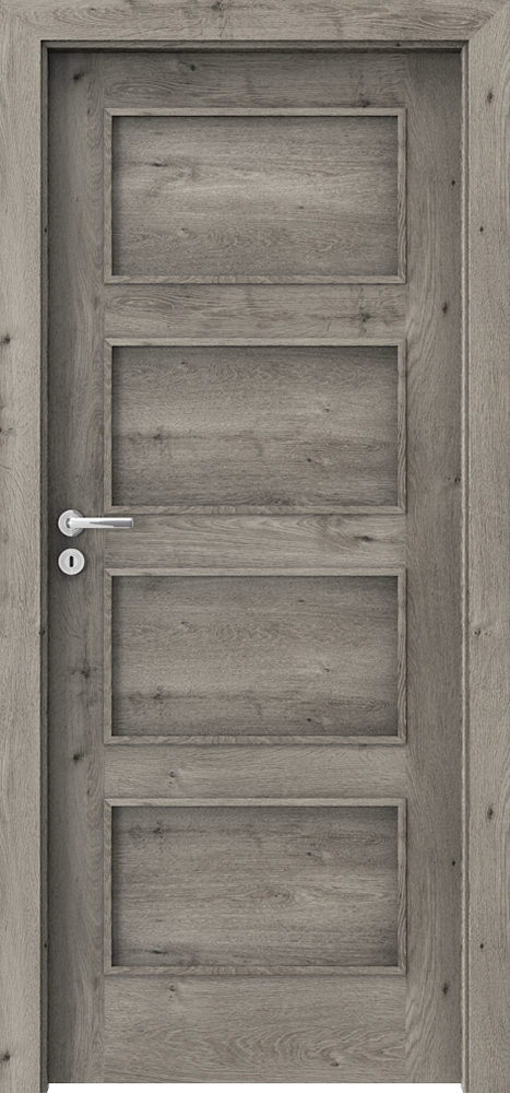 Honeycomb or chipboard core reinforced with rails and stiles (option at extra charge). The construction is skinned with HDF. Chipboard core has a preparation for shortening as a standard. Reinforcement for a door closer and sizes ‚100’ and ‚110‘ requires a third hinge.