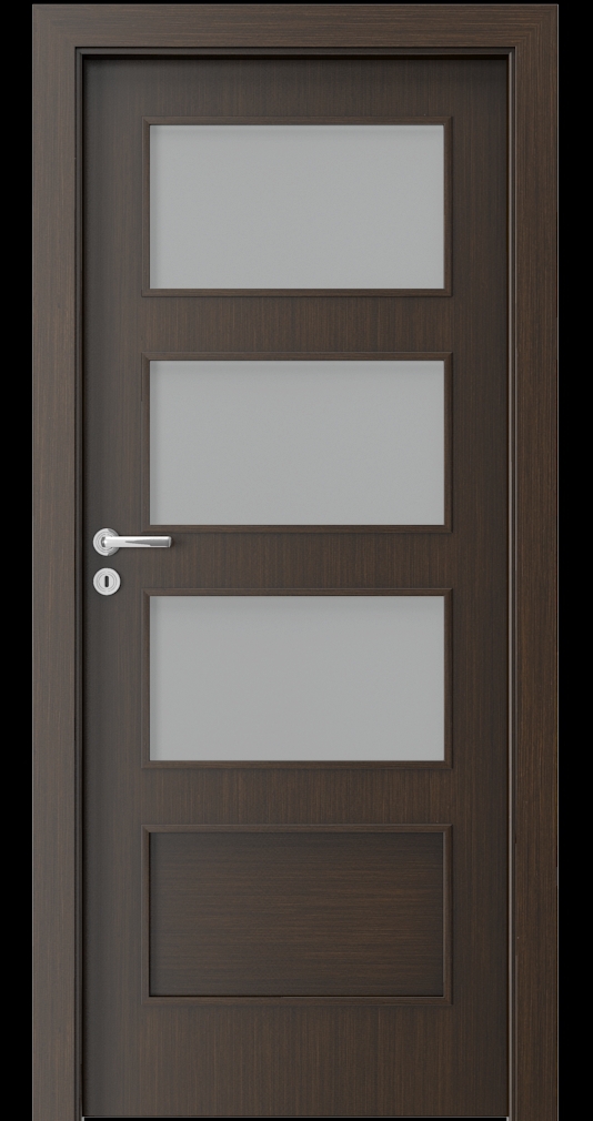 Honeycomb or chipboard core reinforced with rails and stiles (option at extra charge). The construction is skinned with HDF. Chipboard core has a preparation for shortening as a standard. Reinforcement for a door closer and sizes ‚100’ and ‚110‘ requires a third hinge.