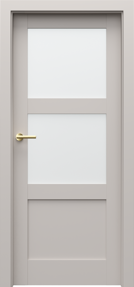 Frame and panel construction. Door leaves contain stiles and frosted, tempered glass. Preparation for shortening maximum 60 mm. Size ‚100‘ requires third hinge.
