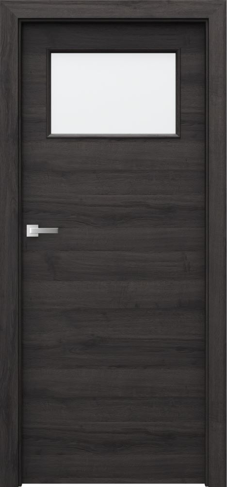 There is lipping ABS on the side edges. Models with decorative inlays – black or silver, 6 mm wide. Glazing – models of group 1 and 7 ‘chinchilla’ glass; frosted tempered glass; transparent glass. Models of group 4 – 8 mm thick frosted, lamienated safety glass. Black glazing is available for model 4.A (optionally at extra charge). The door leaf is skinned with a Gladstone/Halifax board (with structure), a door frame is finished with matching CPL Veneer 0,2 mm.
