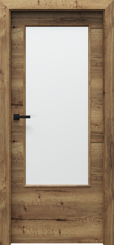 There is lipping ABS on the side edges. Models with decorative inlays – black or silver, 6 mm wide. Glazing – models of group 1 and 7 ‘chinchilla’ glass; frosted tempered glass; transparent glass. Models of group 4 – 8 mm thick frosted, lamienated safety glass. Black glazing is available for model 4.A (optionally at extra charge). The door leaf is skinned with a Gladstone/Halifax board (with structure), a door frame is finished with matching CPL Veneer 0,2 mm.