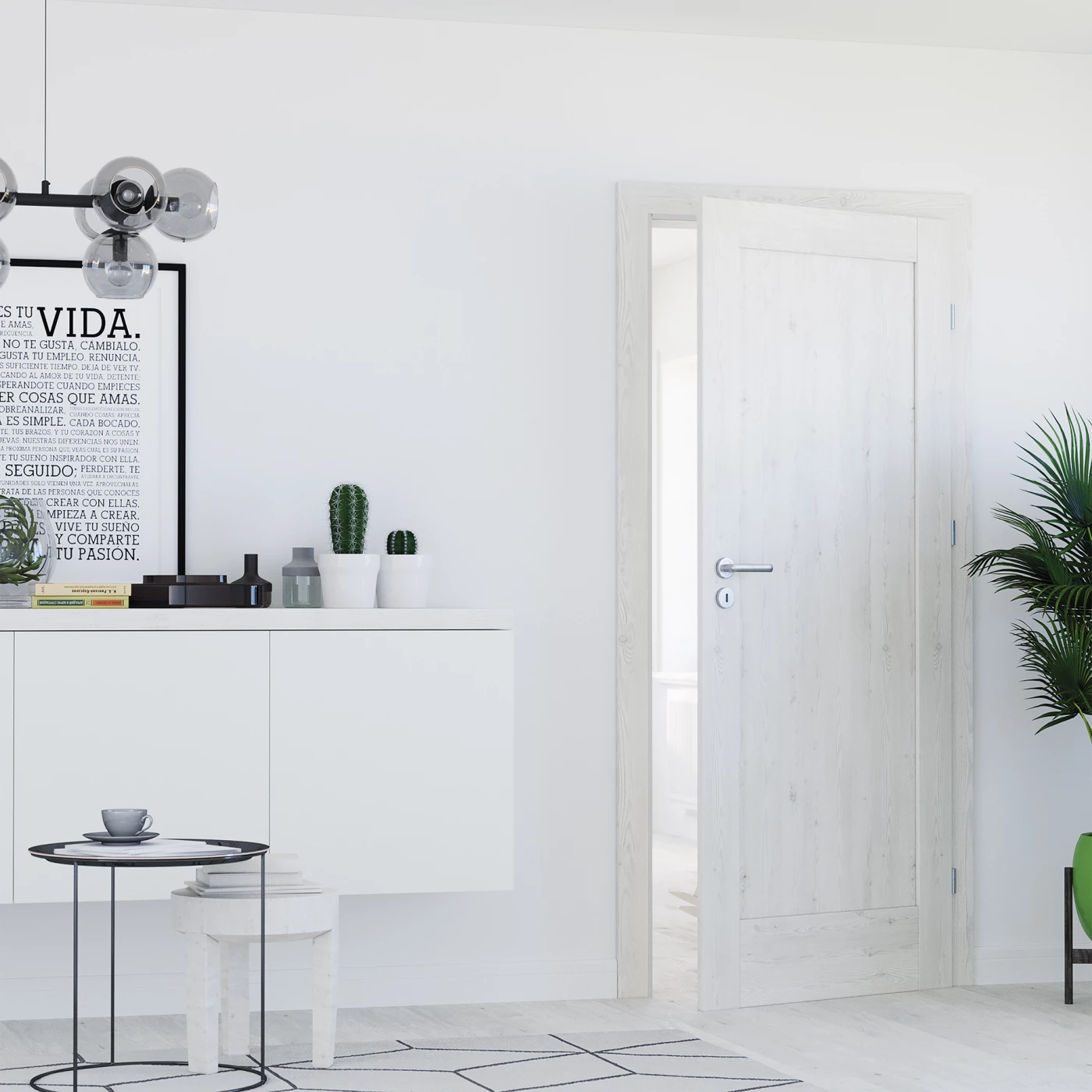 Door leaves contain rails, slim panels and 4 mm thick, frosted, tempered glass. A combination of those depends on a model. Preparation for shortening – maximum 30 mm. Size ‚100‘ requires a third hinge.