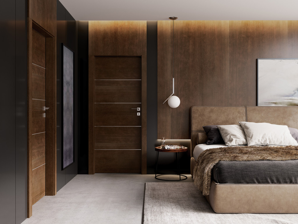 Az egészet kiváló minőségu természetes furnérral bevont panelek borítanak. Az ajtólap felületét ökológiai vízbázisú lakk védi. Az ajtólapot 6 mm széles alumínium intarziák egészítik ki ezüst, arany vagy fekete színben.