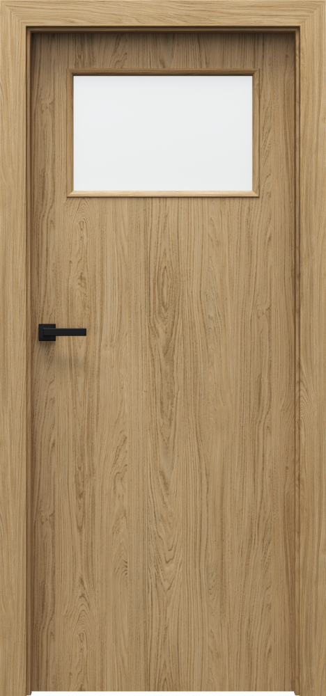 There is lipping ABS on the side edges. Models with decorative inlays – black or silver, 6 mm wide. Glazing – models of group 1 and 7 ‘chinchilla’ glass; frosted tempered glass; transparent glass. Models of group 4 – 8 mm thick frosted, lamienated safety glass. Black glazing is available for model 4.A (optionally at extra charge). The door leaf is skinned with a Gladstone/Halifax board (with structure), a door frame is finished with matching CPL Veneer 0,2 mm.
