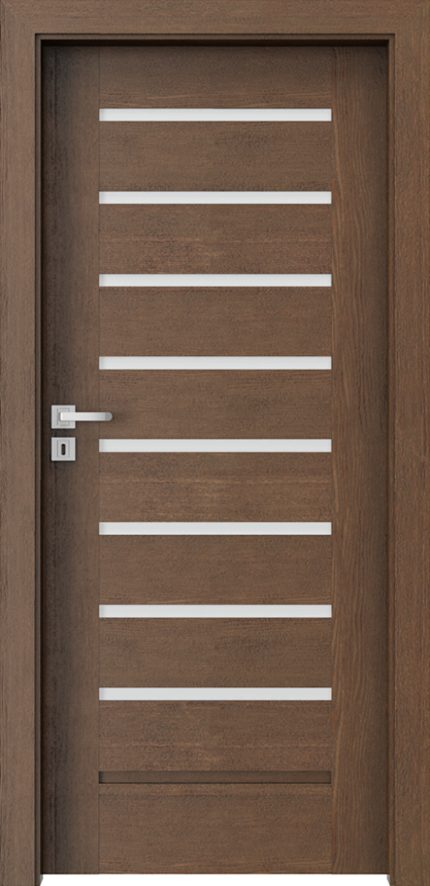 Ușa este finisată cu furnir natural. Ușa este fi nisată cu: Furnir Natural Select, furnir natural Stejar, furnir natural Stejar Satin (excepţie Alb) și protejat cu lac UV semi-mat. Sticlă mată călită.