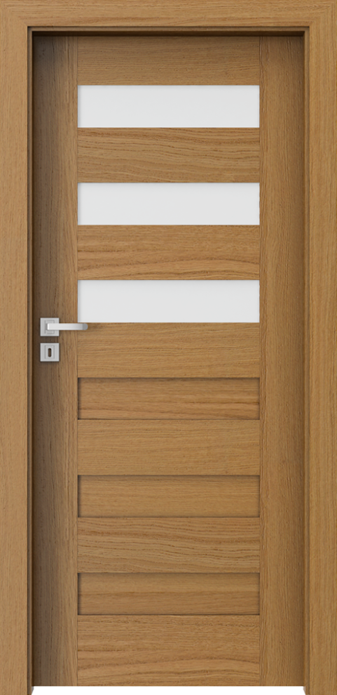 Ușa este finisată cu furnir natural. Ușa este fi nisată cu: Furnir Natural Select, furnir natural Stejar, furnir natural Stejar Satin (excepţie Alb) și protejat cu lac UV semi-mat. Sticlă mată călită.